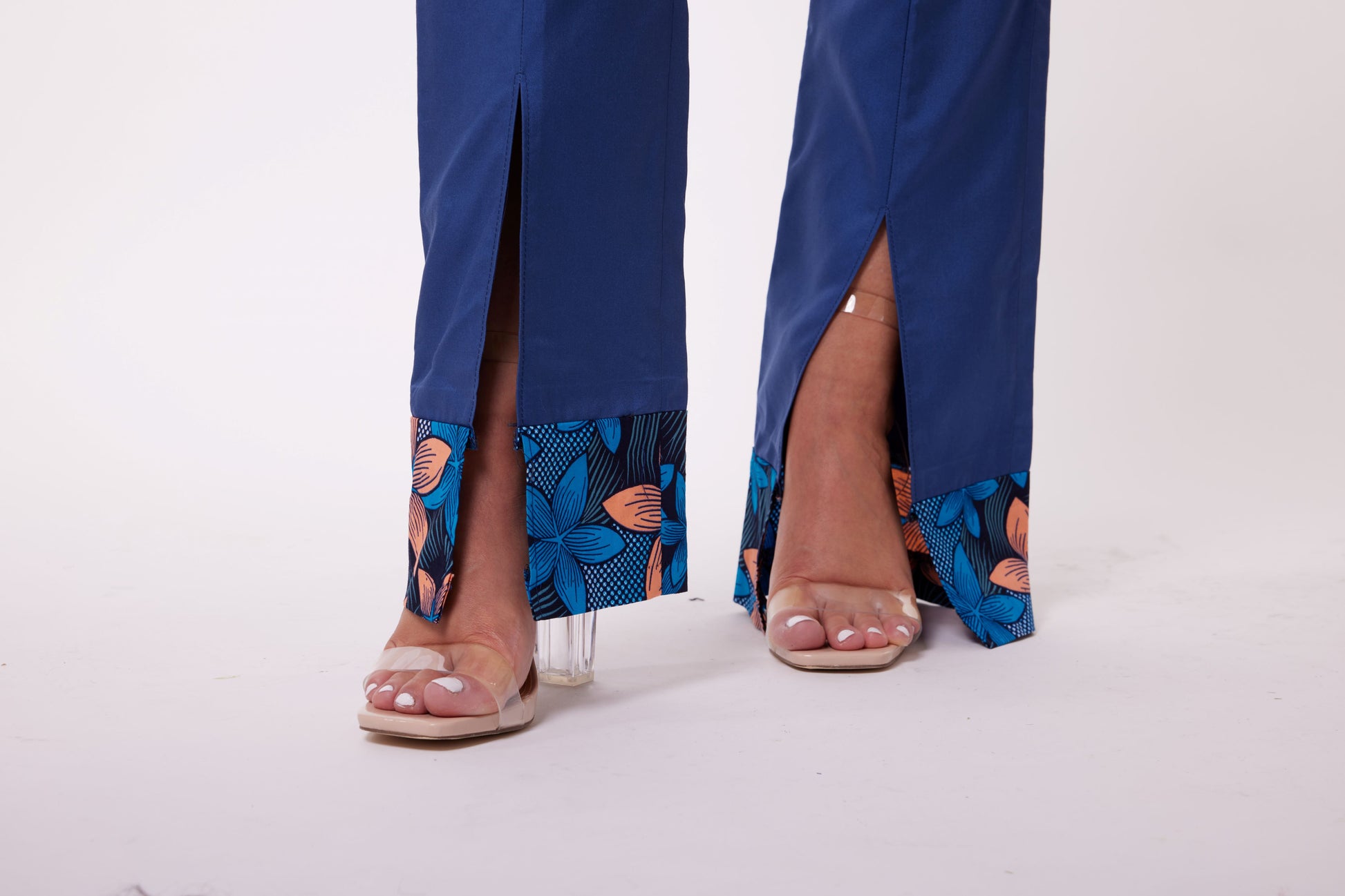 Un des éléments les plus distinctifs de cette combinaison est l'empiècement floral situé à l'arrière, qui offre une surprise visuelle et un contraste coloré par rapport au bleu uniforme du reste du vêtement. Ce détail floral est subtil mais ajoute une touche de fraîcheur et d'originalité. Le bas des jambes est légèrement ouvert, laissant entrevoir la cheville lors des mouvements.
